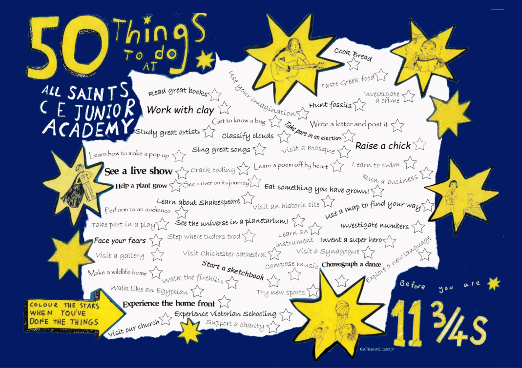 To show our commitment to an engaging and vibrant curriculum, we have created a visual guide for pupils and parents. Here is our '50 Things to do at All Saints CE Junior Academy Before you are 11 3/4s'.